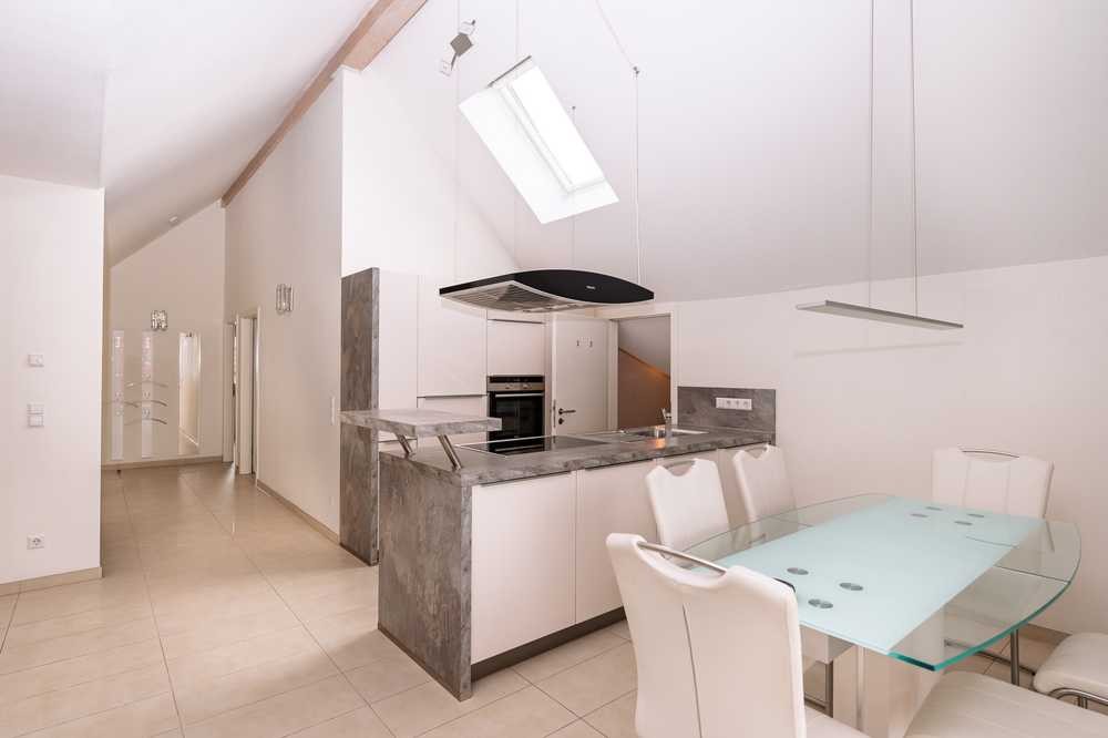 Hohe Decken, elektrische Lichtkuppeln und eine hochwertige, sehr gepflegte Einbauküche machen diese Wohnung zu einem Schmuckstück.