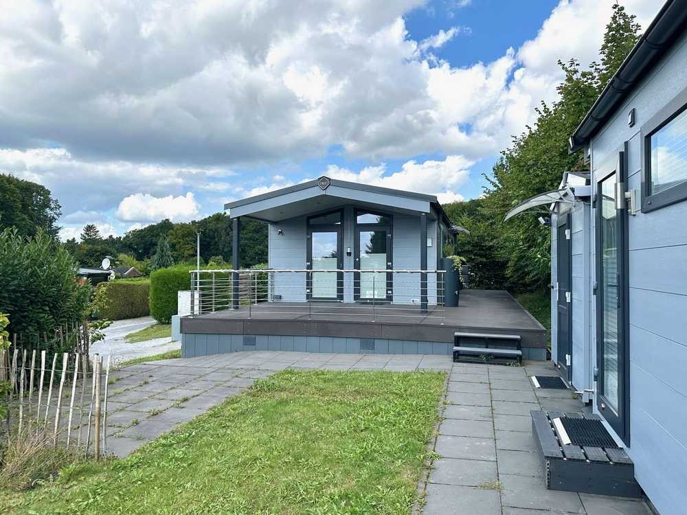 Dieses erst 2020 erbaute Ferienhaus + Anbau von 2023 auf einem ca. 264 m² großen Pachtgrundstück ist mit einer Gesamtfläche von ca. 45 m² und seiner sehr guten Ausstattung eine echte Wohlfühloase. Der Wohn-/Essbereich bieten ausreichend Platz, von dort aus gelangen Sie direkt auf die angrenzende überdachte Terrasse. Das sehr moderne und elegante Badezimmer ist mit einer Regendusche ausgestattet, zudem gibt es ein kleines Fenster. Einen Zugang vom Schlafzimmer auf die Terrasse gibt es ebenfalls. Durch die moderne Bauweise ist das Ferienhaus ein echter Hingucker!