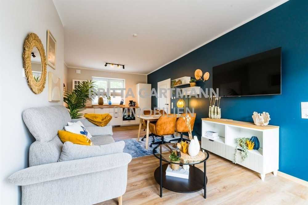 Die zweite Wohnung, befindet sich im Obergeschoss und verfügt über ca. 46 m² Wohnfläche. Sie besticht durch einen lichtdurchfluteten Wohnbereich sowie einer offenen, voll ausgestatteten Küche und einem separaten Schlafzimmer. Auch hier wurde das Tageslichtbad modern gestaltet und verfügt über eine flache Dusche, WC und Waschtisch. Ein besonderes Highlight ist die große, private Dachterrasse mit eigenem Strandkorb – ein echtes Plus für die Nutzung als Ferienwohnung.