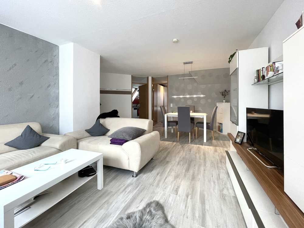 Im Obergeschoss erwartet Sie eine modernisierte 2-Zimmer-Wohnung mit offener, einladender Raumgestaltung und heller Wohnatmosphäre. Das großzügige Wohn- und Esszimmer mit großen Fensterflächen ist der Mittelpunkt der Wohnung, von hier aus gelangen Sie ins Schlafzimmer, die praktische Küche und ins komfortable Duschbad.