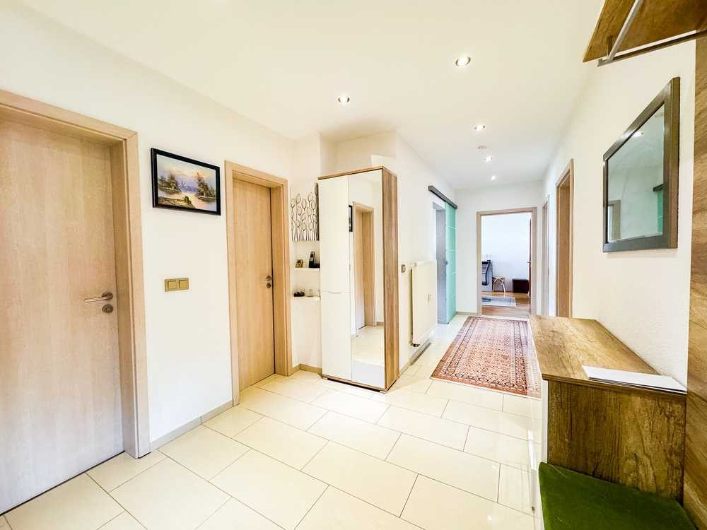 Durch den geräumigen Flur, der dank Deckenspots fast genauso hell ist wie die umliegenden Zimmer, erreichen Sie alle 4 Zimmer, Küche, Bad, Gäste WC und Abstellkammer.