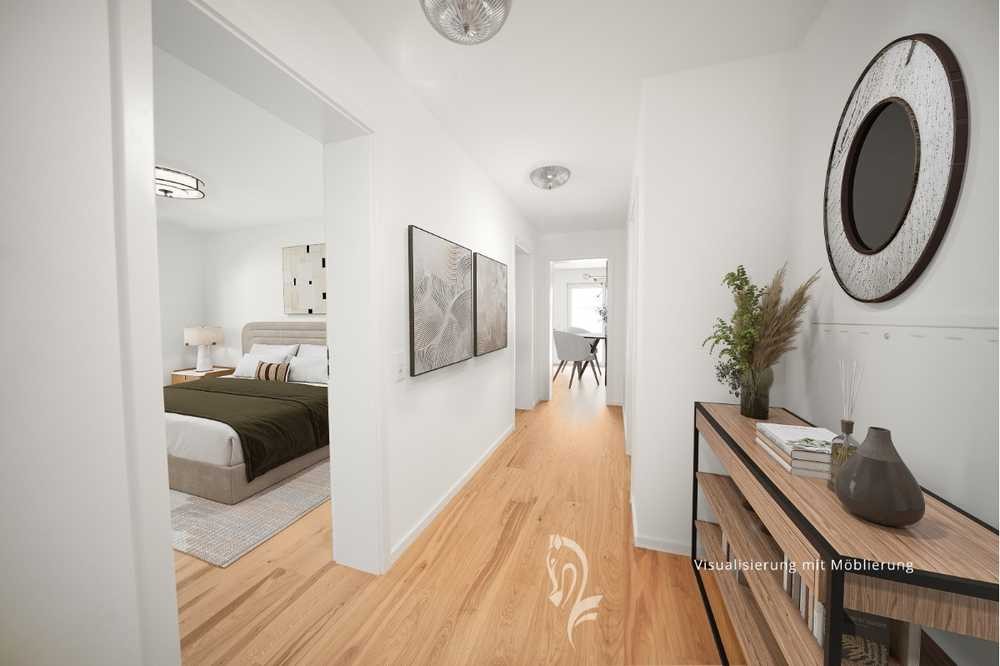 Der Wohnbereich sowie alle Schlafräume sind mit edlem Echtholzparkett und bodentiefen Fenstern ausgestattet, die für ein helles und freundliches Wohnambiente sorgen.