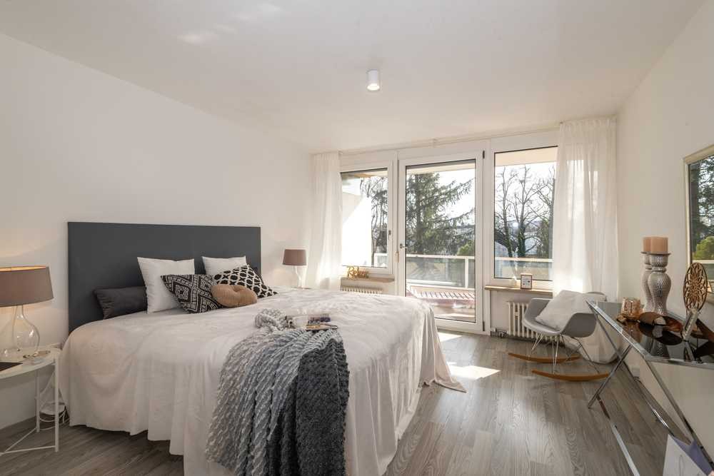 Ein besonderes Highlight ist die kaum einsehbare Süd-Loggia mit unverbautem Blick ins Grüne, der sich über die gesamte Breite der Wohnung erstreckt und sowohl vom Wohnzimmer als auch vom Schlafzimmer aus zugänglich ist. Hier lassen sich sonnige Stunden und eine angenehme Aussicht genießen.