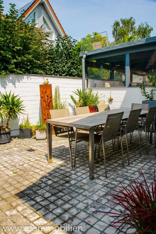 Das Haupthaus umfasst ca. 90 m² Wohnfläche mit offen gestaltetem Wohnbereich und direktem Zugang zur ca. 30 m² großen Terrasse im privaten Innenhof. Im voll ausgebauten Keller stehen zusätzlich rund 30 m² Nutzfläche zur Verfügung, die in der Vergangenheit als Jugendzimmer genutzt wurden. Das Haupthaus wird im Zuge des Verkaufs frei.