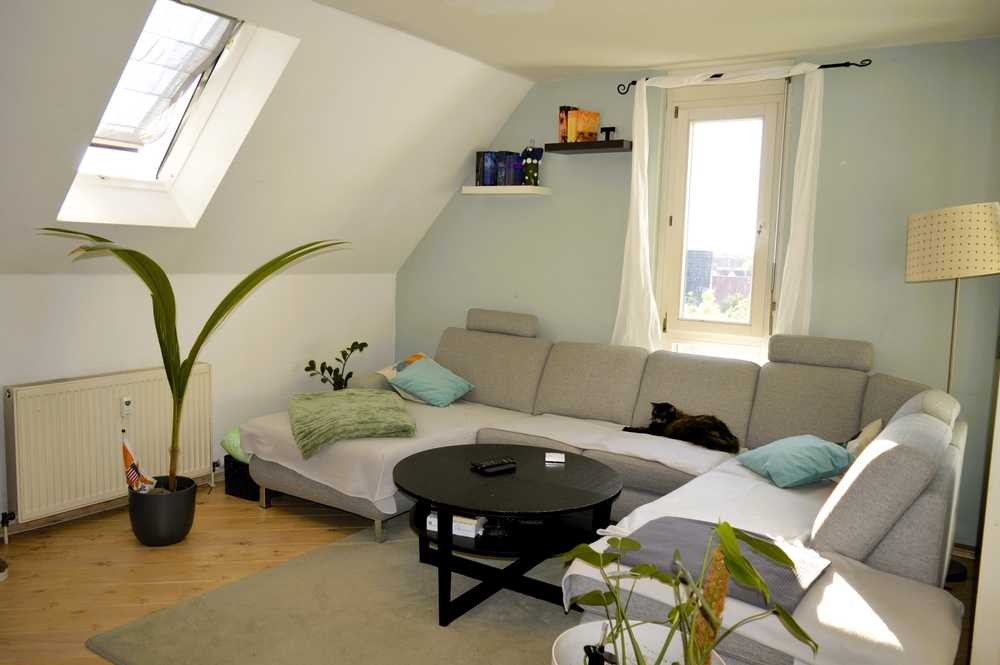 Wohn-/Essbereich Der lichtdurchflutete Living-Bereich mit offenem Grundriss bildet das Herzstück der Wohnung. Die hohen Decken im DG (~3,5 m oder mehr) vermitteln eine imposante Raumwirkung.