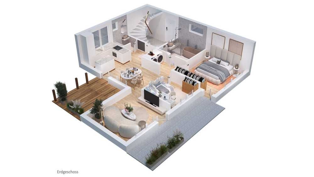 Praktische Aufteilung: Der offene Wohn- und Essbereich bildet das kommunikative Herzstück. Die zwei Schlafzimmer, ein Tageslichtbad mit Dusche und Wanne sowie ein separates Gäste-WC sind funktional und alltagstauglich.