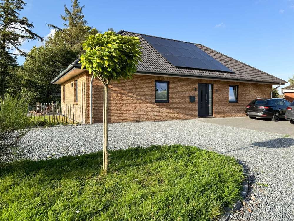 Dieser moderne Bungalow wurde 2022 in Oster-Ohrstedt erbaut und bietet ca. 116 m2 Wohnfläche auf einer Ebene. Die Raumaufteilung umfasst das helle Wohnzimmer mit angrenzender Küche und Zutritt zur Terrasse, das Hauptschlafzimmer mit Bad en Suite, zwei weitere Schlafzimmer, ein Gästebad mit Dusche sowie einen praktischen Hauswirtschaftsraum. Zusätzlich steht eine Ausbaureserve von ca. 60 m2 im Obergeschoss zur Verfügung. Der Eingangsbereich ist hierfür bereits großzügig angelegt worden, sodass eine Treppe problemlos integriert werden kann. Das großzügige Grundstück von ca. 1.100 m2 lädt mit der Terrasse und dem Garten in Ausrichtung Westen bereits ab den Mittagstunden zum verweilen ein.
