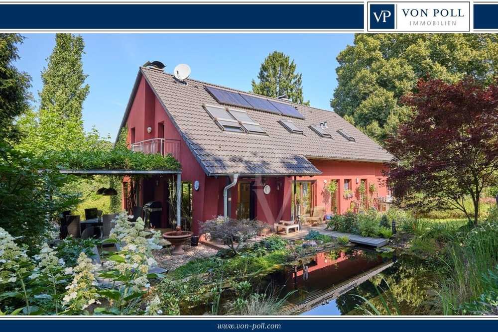 Der Außenbereich präsentiert sich als naturnah gestalteter, parkähnlicher Garten mit besonderem Highlight: Der Schwimmteich lädt zum Entspannen und Erholen ein. Für gesellige Stunden stehen Ihnen eine großzügige überdachte Terrasse sowie eine modern gestaltete Lounge-Terrasse zur Verfügung – ideal für Familienfeste und entspannte Abende im Freien. Durch das herrlich eingewachsene Grundstück ist Ihre Privatsphäre gewährleistet .