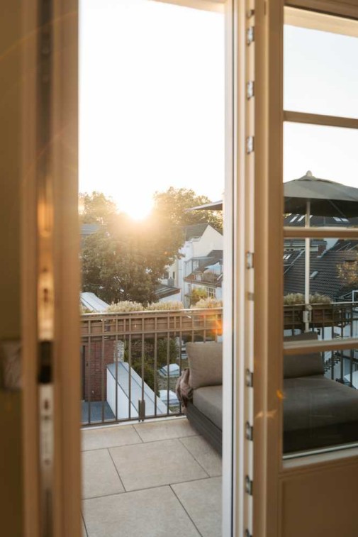 Der sonnige Balkon mit Blick auf den Fernsehturm verbindet Ruhe und Privatsphäre. Ergänzt durch modernste Smart-Home-Technik und eine hauseigene Tiefgarage entsteht ein einzigartiges Gesamtpaket.