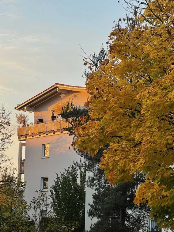 Das Baujahr des Bestandsgebäudes ist 1960. Das Haus wurde im Jahr 2000 um eine Etage aufgestockt. In dieser Aufstockung befindet sich die angebotene 3 Zimmer Dach-Atelier-Wohnung mit Dachterasse und umlaufenden Balkon mit großzügigem Dachüberstand. Die Dachterasse hat eine sonnige Ausrichtung nach Südost. Vom gesammten Balkon der von der Nordseite über die Ostseite bis zur Südseite umläuft hat man einen unverbauten Blick ins Grüne über die Dächer der Nachbarschaft.