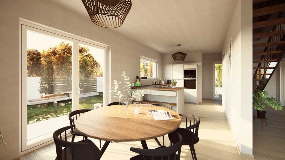Geschmackvoll, lichtdurchflutet und offen - so lässt sich unser Haus Design 11 charakterisieren. Unter dem zeitlos-eleganten Satteldach laden rund 135 m² Wohnfläche zum Leben, Wohlfühlen und Träumen ein. Die offene Architektur im Erdgeschoss vermittelt ein Gefühl von Weite, ohne dabei an Gemütlichkeit und Behaglichkeit einzubüßen. Dafür sorgt die besondere Raumeinteilung: Die geräumige Diele geht - lediglich getrennt durch einen kleinen Vorsprung - direkt in den Koch- und Ess-Bereich über. Und der besticht nicht nur durch seine Größe, sondern auch durch seine Helligkeit. Dafür sorgen zahlreiche Fenster, die einen direkten Blick in den Garten gewähren. Auch das Wohnzimmer ist unmittelbar von der Diele aus zugänglich und mit seinen knapp 20 m² ein echter Wohlfühlort. Ebenfalls Parterre: Hauswirtschaftsraum sowie Gäste-WC. Über die Diele führt eine halbgewendelte Treppe in den Bereich, in dem Erholung und Entspannung im Fokus stehen. Hier befinden sich neben dem Schlafzimmer für die Eltern noch zwei Kinderzimmer sowie ein großes Bad. So geht stilvoll Wohnen.