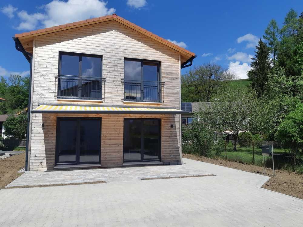 Neugebautes Holzhaus eines bayerischen Qualitätsherstellers (abweichend zum Bild hier mit zwischenzeitlich begrünten Außenanlagen).