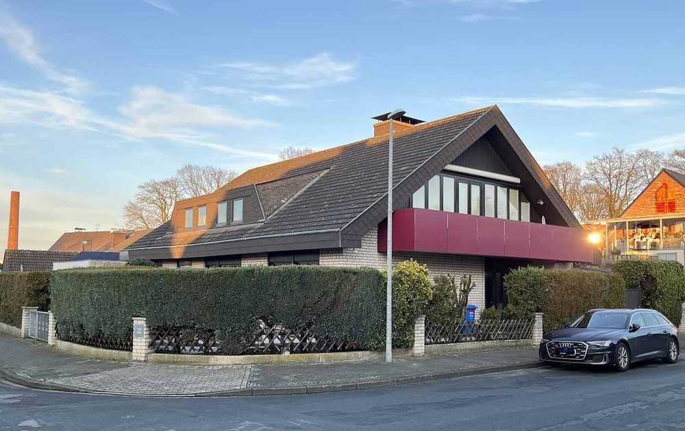 Das Haus, in dem sich diese schöne Obergeschosswohnung befindet, liegt sehr ruhig und grün an einer kleinen Wohnstraße im Norden von Greven, umgeben von freistehenden Einfamilienhäusern mit großen grünen Gärten. Bis in die Innenstadt sind es etwa 1.100 m Luftlinie. Diese elegante und optimal geschnittene 4-Zimmer Eigentumswohnung ist etwas ganz Besonderes. Es ist nur noch eine andere Wohnung darunter. Hier wohnen Sie großzügig auf über 127 m² Wohnfläche. Das Haus wurde 1979 im exklusiven Villenstil gebaut. Der weiße Klinker passt prima zu dem schwarzen Dach und den dunklen Holz-Sprossenfenstern. Das Haus steht auf einem Eckgrundstück, rundum ist es wunderbar blickgeschützt von schönen Hecken und Büschen. Links gibt es eine Doppelgarage, diese gehört zur Erdgeschoßwohnung. Die Garage unserer Wohnung liegt rechts hinter dem Haus. Davor befindet sich noch ein Stellplatz für einen weiteren Pkw. Ein großer Vorgarten führt zum Haus und zur Eingangstür im Landhausstil. Der große Eingangsbereich ist hell gefliest. Rechts führt die Treppe nach oben in unsere Wohnung. Oben an der Treppe gibt es einen kleinen Garderobenbereich. Dahinter betreten wir die Wohnung und stehen in der hübschen Diele mit angrenzendem Flur. Von dort gehen alle Zimmer ab. Rechts betreten wir das Highlight der Wohnung, das helle Wohn- und Esszimmer mit gemauertem Kamin. Hier laden 41 m² ein zu gemütlichen Stunden. Der Glaseinsatz im Kamin sorgt dafür, dass die Wärme auch effektiv genutzt wird.