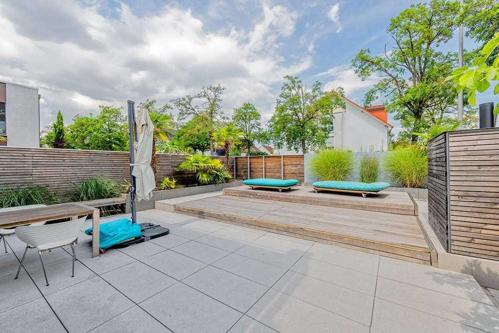 Das 289 m² große Grundstück wurde ebenfalls mit modernen Elementen gestaltet und