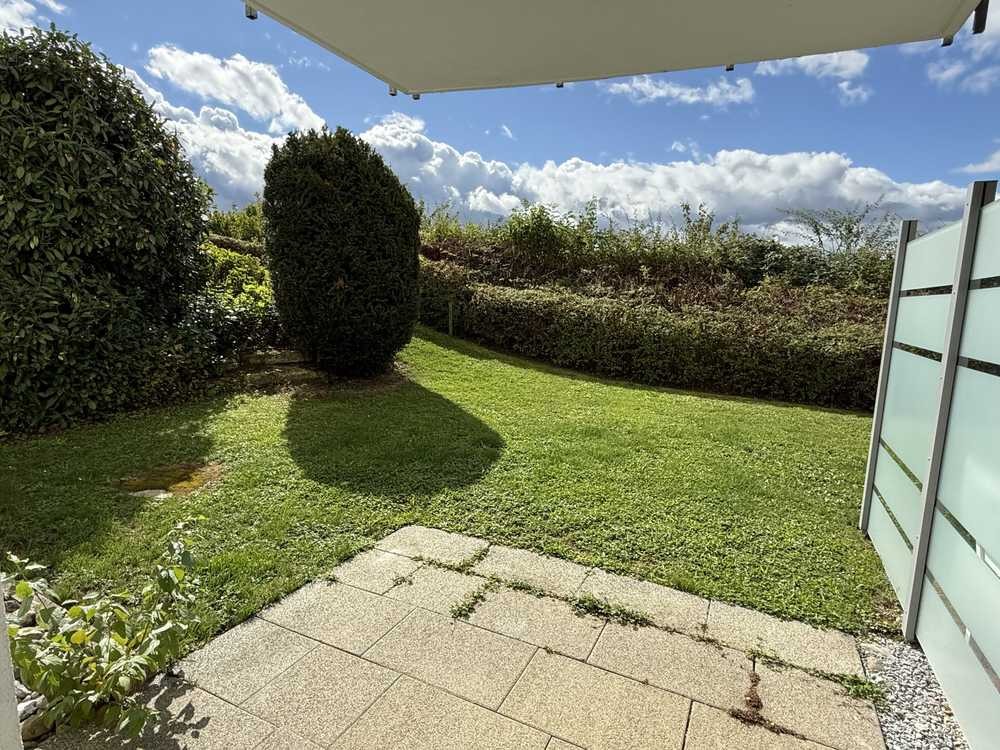 Vom Wohnzimmer aus gelangen Sie auf die nach Südwesten ausgerichtete Terrasse, von wo aus Sie die Sonnestunden mit direktem Blick in den Garten genießen können.