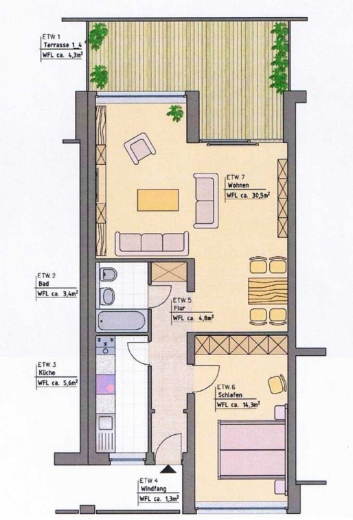 Zum Verkauf steht diese Wohnung im Erdgeschoss der Wohnanlage "Bei Mönchsgarten", gelegen auf einem parkähnlichen Grundstück. Eine 15m2 große, ebenerdige Loggia lädt zum Entspannen ein und die Südwestausrichtung führt zu viel Licht in der Wohnung.