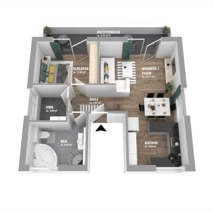 Von diesem Bereich gelangen Sie direkt auf die sonnige Dachterrasse in Südlage – ein echtes Highlight, das zum Entspannen, Sonnen oder zu geselligen Abenden mit Freunden einlädt.