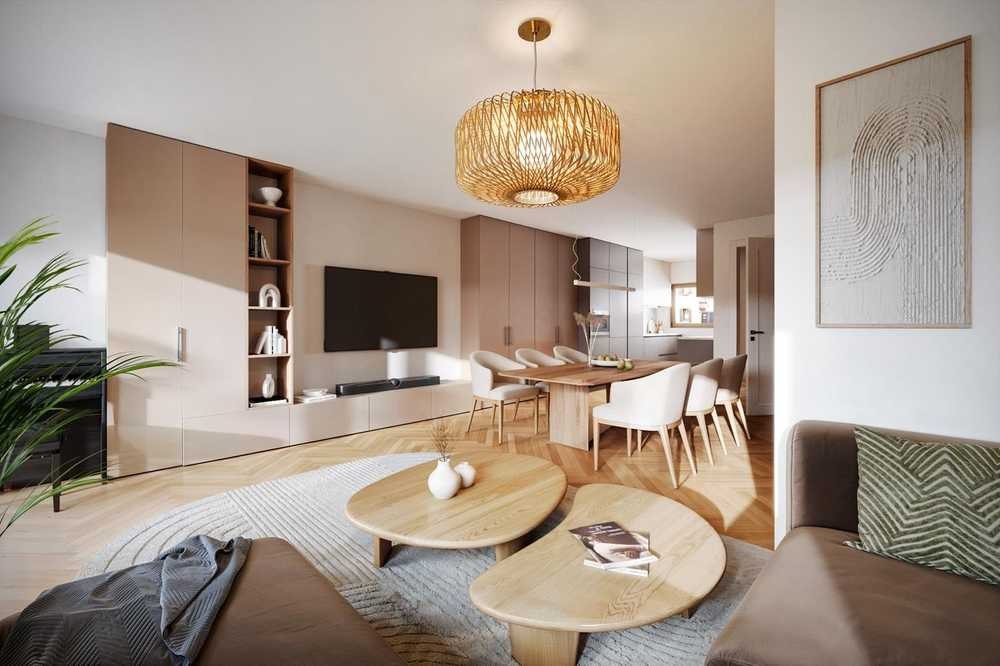 Große Fensterfronten in elegantem Perlbeige sorgen für eine freundliche Atmosphäre und holen viel Tageslicht in die Wohnbereiche. Der offen gestaltete Wohnraum schafft eine warme, einladende Umgebung – ideal für Familien oder Paare mit Anspruch an Qualität und Komfort.