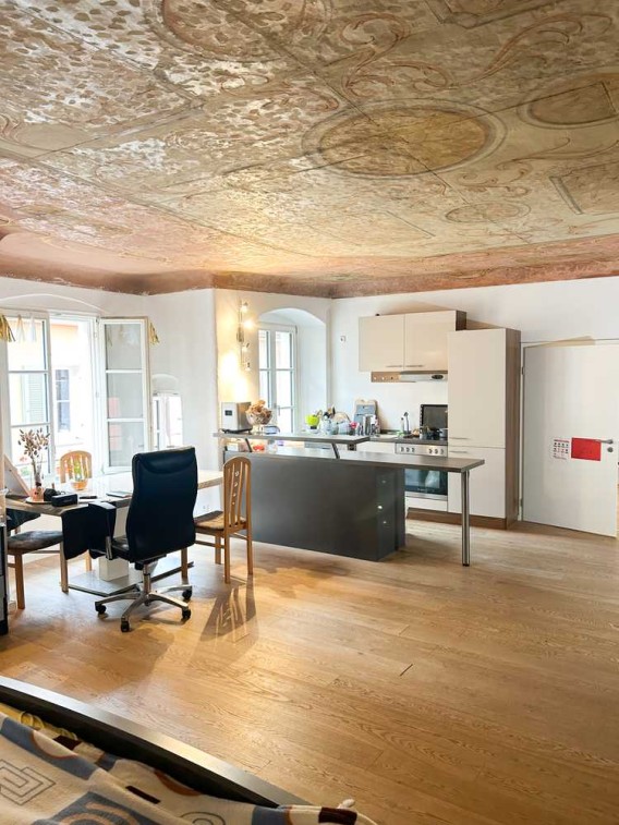 Zusätzlich gibt es noch ein Durchgangszimmer zum Badezimmer, das sowohl als Büro oder Schlafzimmer genutzt werden kann. Das Highlight der Wohnung ist die historische Deckenbemalung.