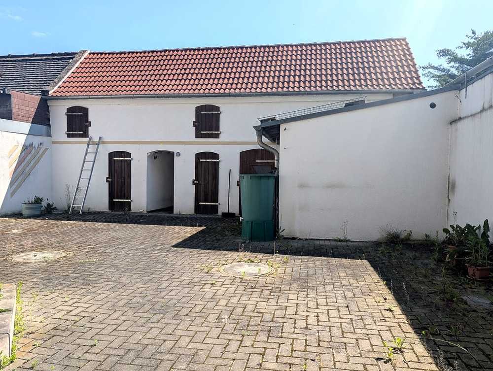 Die Immobilie verfügt über eine gepflasterte Hofeinfahrt mit elektrischem Rolltor, die in einen geschützten Innenhof mit praktischem Nebengelass führt. Von hier aus gelangen Sie direkt in den Garten mit überdachtem Sitzbereich und gepflasterten Wegen sowie Rasenflächen – ideal für entspannte Stunden im Freien.
