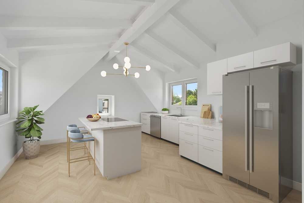 Das Schlafzimmer liegt gemütlich unter der Dachschräge, während der Wohnbereich mit luftiger Offenheit überzeugt. Die offene Essküche verbindet Kochen, Wohnen und Genießen – mit Blick bis in den Dachfirst.