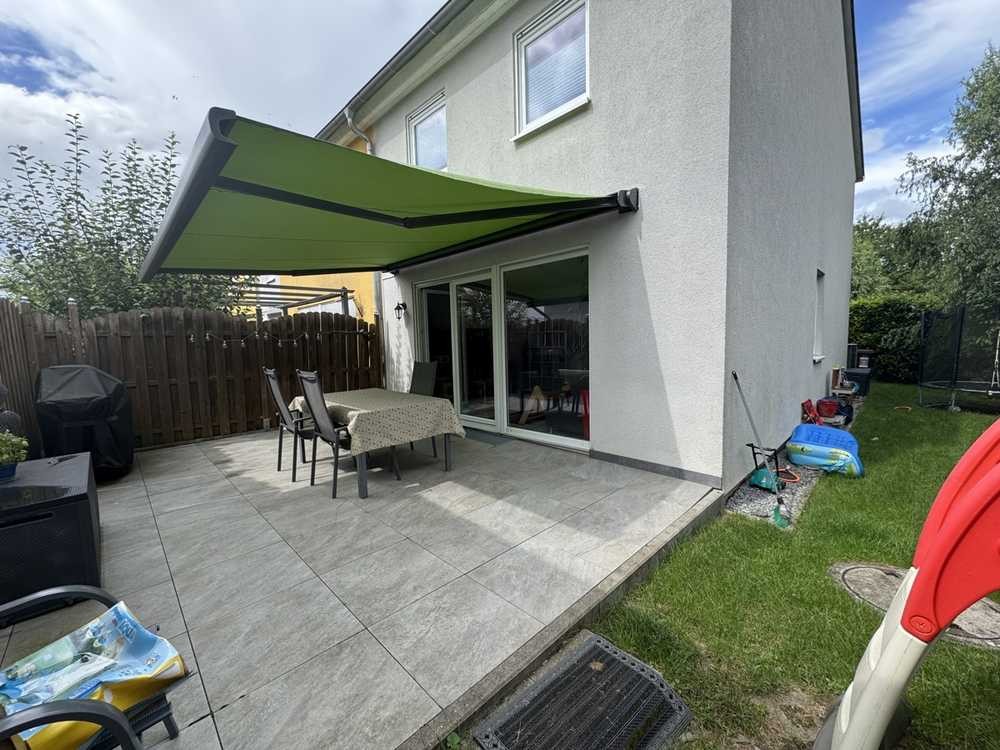 Im Erdgeschoss erwartet Sie eine gut ausgestattete Küche und ein Gäste-WC. Das Herzstück des Hauses ist der offene Wohn- und Essbereich, der direkten Zugang zur Sonnenterrasse bietet. Diese ist mit einer elektrischen Markise ausgestattet und lädt zum Entspannen ein.