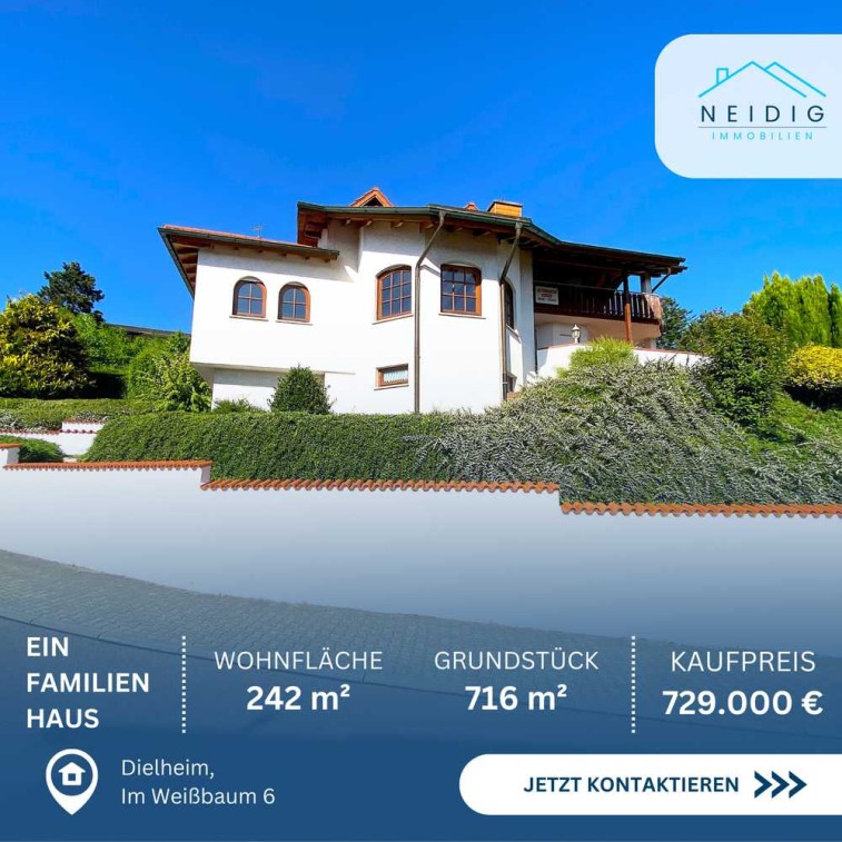Dieses 1990 erbaute und gepflegte Einfamilienhaus in ruhiger Wohnlage von Dielheim bietet mit ca. 242 m² Wohnfläche auf zwei Ebenen ein einzigartiges Raumgefühl und hohe Wohnqualität. Es überzeugt durch seine durchdachte Architektur, die Großzügigkeit mit Funktionalität verbindet. Der klare Schnitt zwischen öffentlichem und privatem Bereich schafft ein harmonisches Wohngefühl – ideal zum Empfang von Gästen mit gleichzeitigem Rückzugsort.