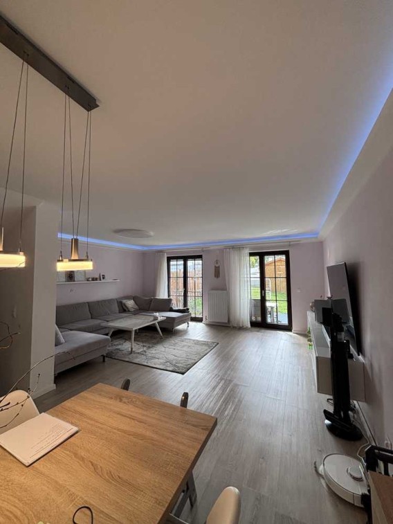 Die Immobilie erstreckt sich über Erdgeschoss- und Souterrainebene und bietet mit einer Wohnfläche von ca. 98 m² ein durchdachtes Raumkonzept mit viel Platz für individuelles Wohnen. Herzstück ist das großzügige, lichtdurchflutete Wohnzimmer mit angrenzender Küche und Gäste-WC – ein idealer Ort für entspannte Abende und geselliges Beisammensein.