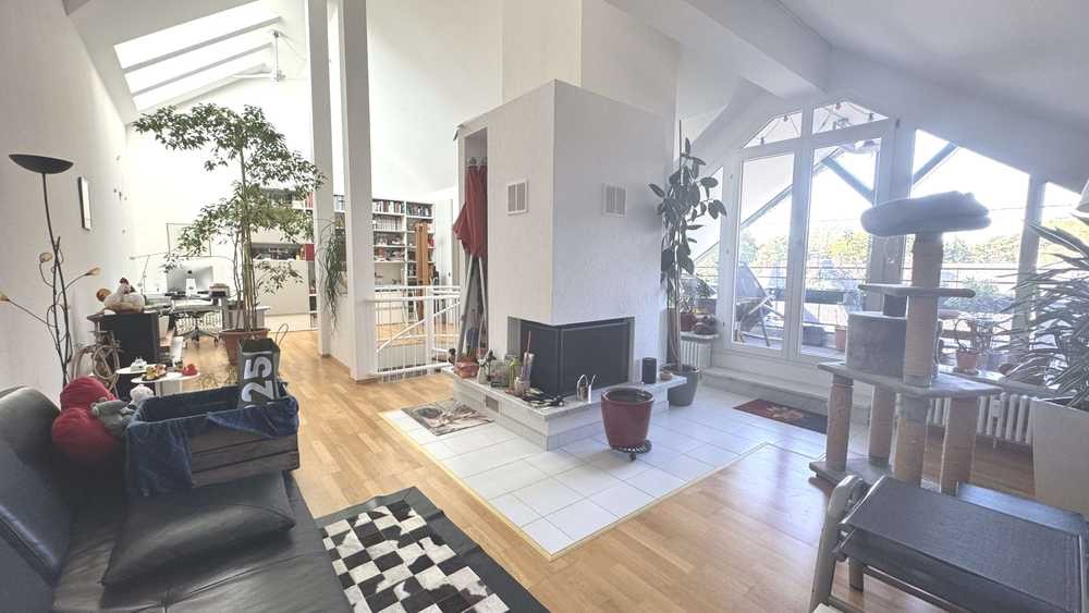 Das eigentliche Highlight erwartet Sie im Dachgeschoss, denn dort findet sich die besondere Architektur mit einer über 5 Meter hohen Decke und aufwendiger Dachkonstruktion. Der hochwertige Kassettenkamin ist im hinteren Bereich untergebracht und lädt zu schönen Kaminabenden ein.