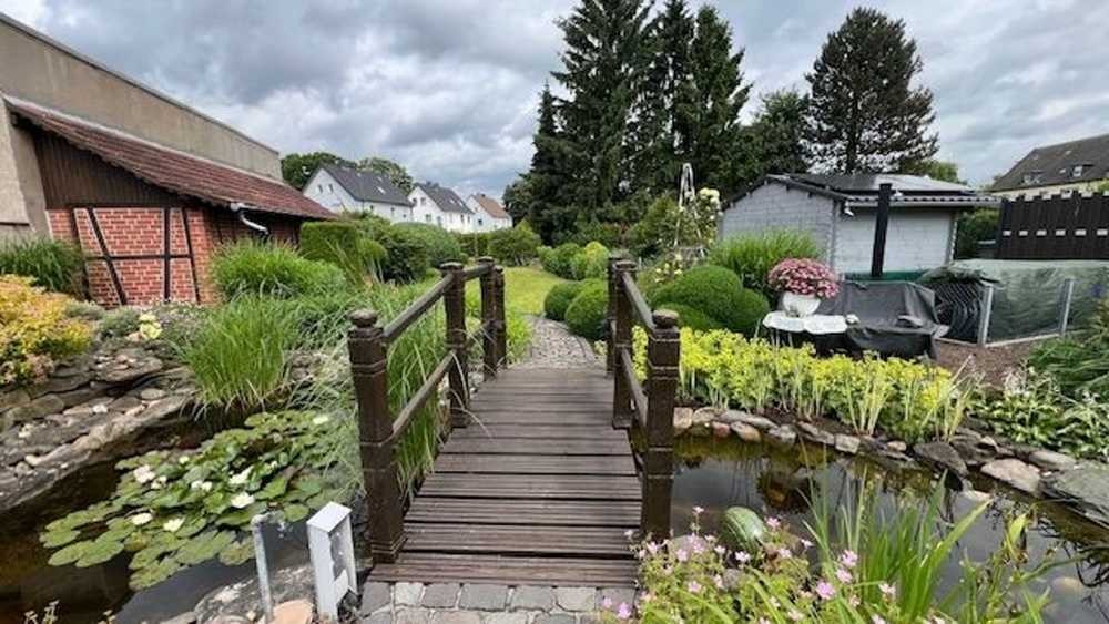 Großzügiger Garten mit liebevoll angelegtem Teich, idyllischer Brücke, gemauertem Gartenhaus und gepflegtem Grün – ein echtes Paradies für Gartenliebhaber
