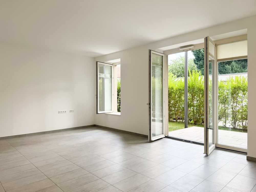 Der Mittelpunkt der Wohnung ist das großzügige Wohn- und Esszimmer mit offener Küchenlösung auf rund 35 m². Eine Einbauküche ist aktuell nicht vorhanden, doch durchdacht geplant: Unter einer Bodenfliese ist eine Vorrichtung für einen Küchenblock integriert – ideal, um die Küche ganz nach den eigenen Vorstellungen zu gestalten. Die gesamte Wohnung ist mit stilvollen grauen Feinsteinzeugfliesen ausgestattet und wird über eine komfortable Fußbodenheizung beheizt. Jedes Zimmer kann individuell über Raumthermostate reguliert werden – auch das Badezimmer, das zusätzlich mit einem Wandhandtuchtrockner ausgestattet ist.