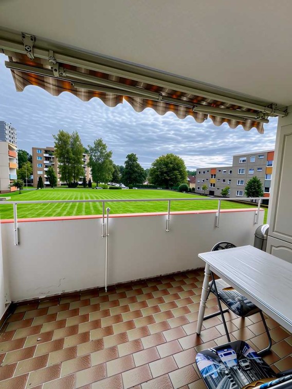 Von hier aus gelangen Sie auf den überdachten Balkon mit einer Markise– ein idealer Ort für entspannte Stunden im Freien, ob morgens bei einer Tasse Kaffee, Tee oder abends mit Blick ins Grüne.