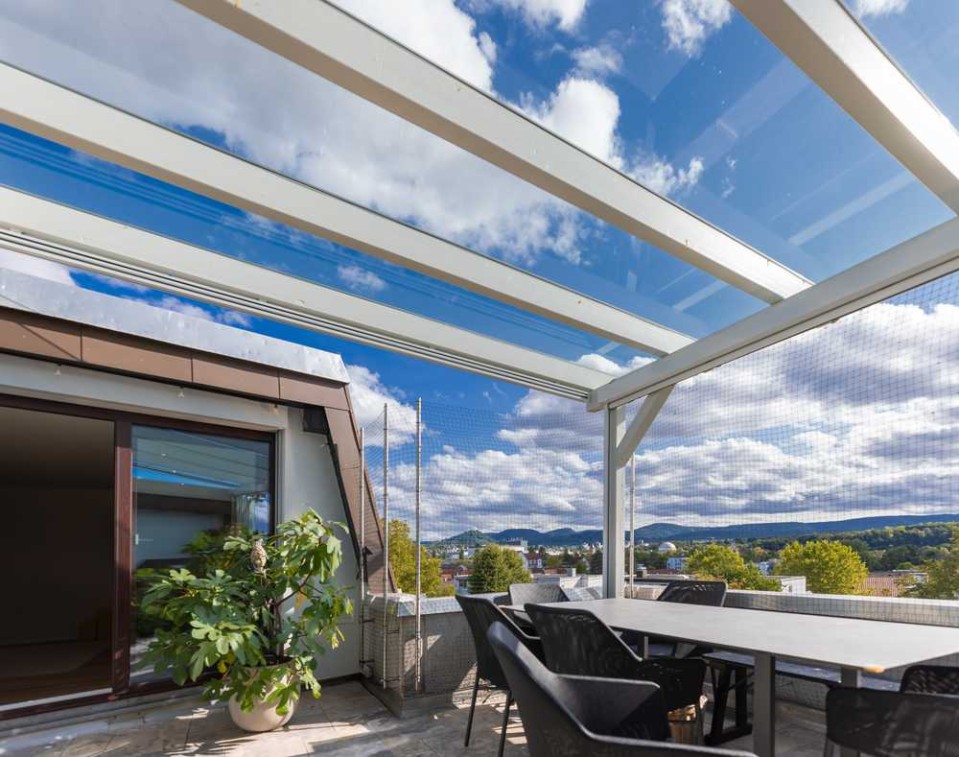 Ein besonderes Highlight ist die verglaste Pergola auf der Dachterrasse, die den Wohnraum nach draussen erweitert.