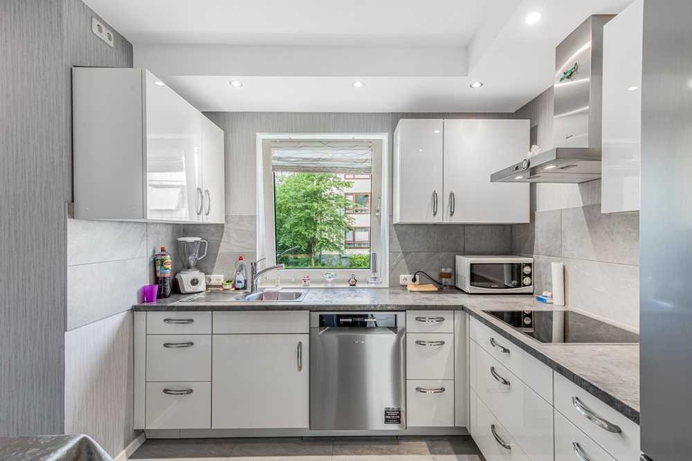 Das Raumangebot umfasst ein großzügiges Wohn- und Esszimmer mit ca. 19,96 m², drei gut geschnittene Schlafzimmer (12,69 m² / 13,24 m² / 11,68 m²), eine separate Küche (11,04 m²) mit praktischer Nische für Waschmaschine und Trockner sowie ein modernes Tageslichtbad mit Dusche und großer Eckbadewanne. Bad und Einbauküche wurden 2019 vollständig erneuert. Die Küche ist mit hochwertigen Geräten, Soft-Close-Funktion und einem zeitlosen Design ausgestattet.
