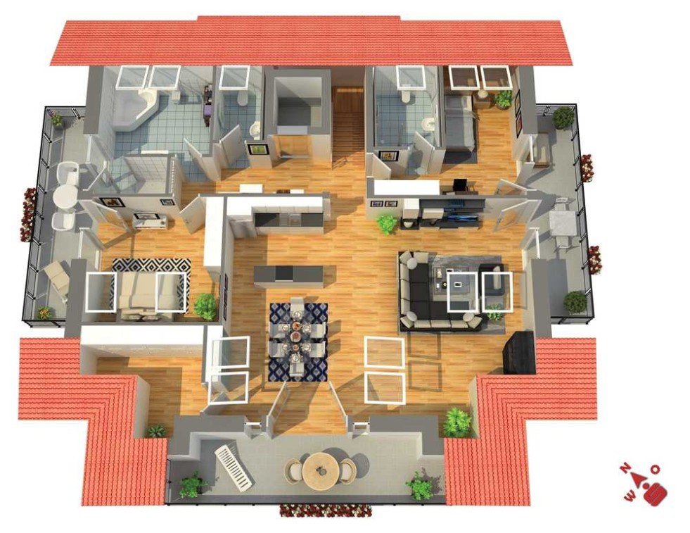 Neben einem Gäste-WC verfügt die Wohnung über ein Bad mit Dusche und WC, sowie ein großes Bad mit Dusche, Badewanne und WC.