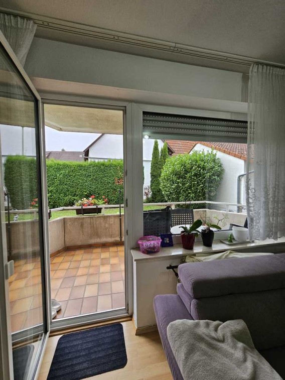 Das Highlight ist das großzügige Wohnzimmer mit direktem Zugang zum Balkon. Von hier aus genießen Sie den Blick in den grünen, gepflegten Gartenbereich auf der Rückseite des Hauses – ein idyllischer Rückzugsort, der zum Entspannen einlädt.