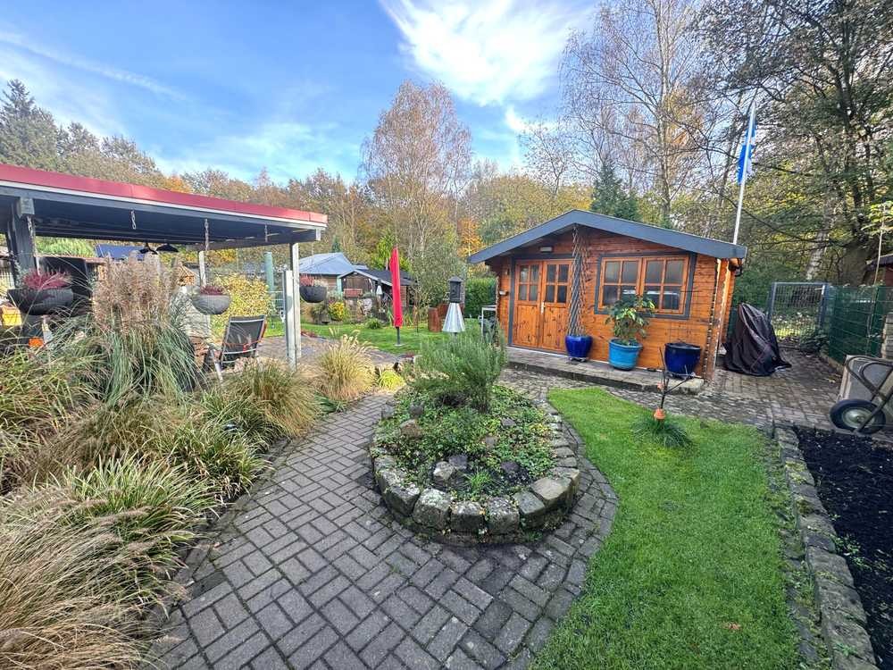 Vom Keller aus gelangen Sie über wenige Stufen zum zurückliegenden Teil des Grundstückes. Hier befindet sich Ihre eigene Garage (aufgrund fehlender Zuwegung nicht für PKW), dessen Dachfläche mit einer Photovoltaikanlage ausgestattet ist. Zudem finden Sie in diesem Bereich die Zuwegung zu einem weiteren Highlight dieses Immobilienangebots, dem eigenen, vollständig eingezäunten Gartenbereich hinter dem Haus. Hier kommen Gartenfreunde voll auf Ihre Kosten. Neben ausreichend Grünflächen begeistert dieser liebevoll angelegte Bereich durch diverse, teilweise überdachte Terrassen, ein gemütliches Gartenhaus sowie einen Teich. Hier können Sie bei jedem Wetter Ihre Zeit im Freien genießen und beispielsweise Familie und Freunde zum gemeinsamen Grillen einladen. Von Ihrem eigenen Garten führt ein Tor zu einem Waldstück, das hinter dem Grundstück liegt.