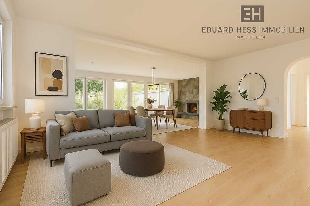 Schon beim Eintreten spüren Sie die Großzügigkeit: ein geräumiges Entrée/Garderobe und ein lichtdurchfluteter Wohn- und Essbereich (ca. 67 m²) mit offenem Kamin bildet das Herzstück des Hauses - der perfekte Ort für gesellige Abende und stille Momente gleichermaßen. Von hier öffnet sich der Blick auf die Sonnenterrasse und den Garten, der Raum für Ihre Träume lässt - ob blühende Oase, Spielparadies für Kinder oder Rückzugsort.