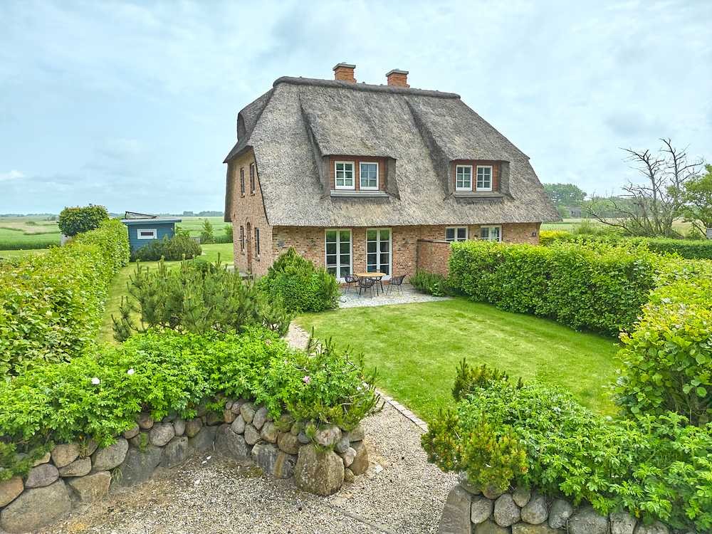 Das real geteilte und damit eigene Grundstück mit einer Größe von 865 m² bietet ausreichend Raum zur freien Entfaltung. Alle umliegenden Nachbarhäuser liegen auch unter Reet, auf ebenfalls großzügigen Grundstücken – so bietet sich ein harmonisches Bild und ausreichend persönliche Komfortzone. Der herrliche Ausblick auf benachbarte Felder, Wiesen, Marschland und die gewachsene Knicklandschaft machen den idyllischen Eindruck perfekt. Der Böhler Strand ist nur 550 Meter entfernt, zum Nordsee-Golfclub sind es nur 600 Meter.