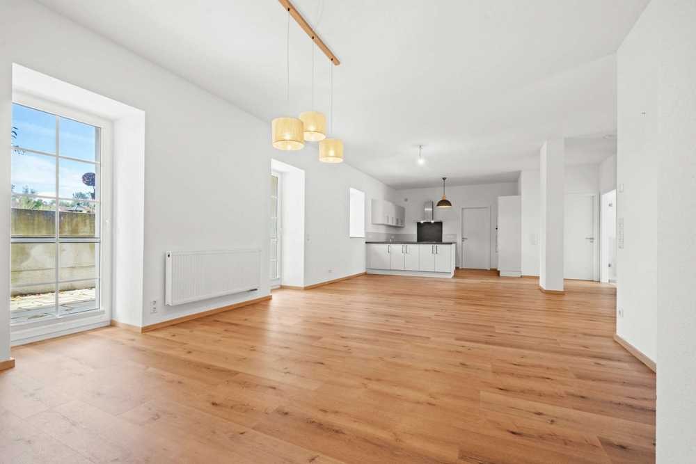 Von hier aus öffnet sich die Wohnung in ihren Mittelpunkt, den weitläufigen Wohn- und Essbereich. Der Raum überzeugt durch seine freundliche Ausstrahlung und die natürliche Belichtung. Großzügige Fensterflächen schaffen zudem den direkten Übergang zur Terrasse, die sich wie ein erweitertes Wohnzimmer im Freien nutzen lässt. Ob Frühstück in der Morgensonne, entspanntes Sonnenbaden am Nachmittag oder ein Glas Wein in den Abendstunden, hier genießen Sie Ihre private Auszeit im Grünen.