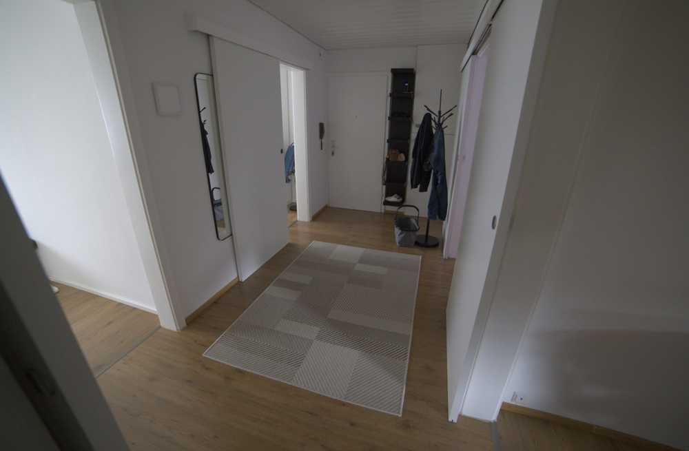 Die Diele erschließt das weiß geflieste Badezimmer, das Schlafzimmer, das Büro/Kinderzimmer, die Küche und das Wohnzimmer. Der an der Küche anschließende, überdachte Balkon ist über das Wohnzimmer erreichbar. In der Wohnung wurden Fliesen- und Laminatböden verlegt.