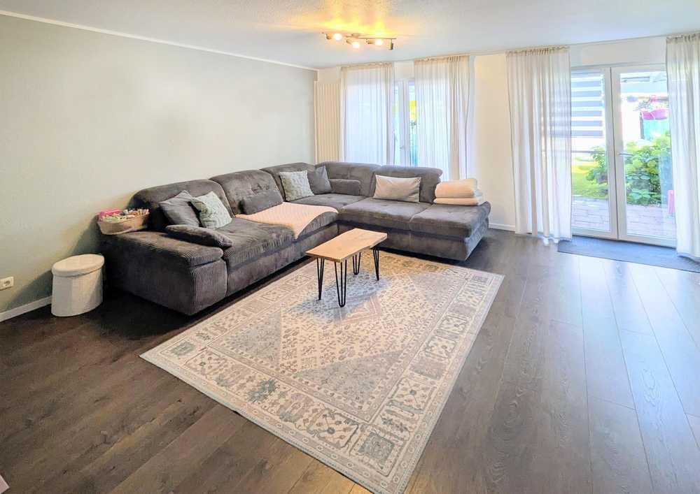 Sie betreten die Immobilie im Erdgeschoss durch einen Windfang, dort sind das Gäste-WC und die Garderobe untergebracht. Von der sich anschließenden zentralen Diele erreichen Sie die Küche und den großzügigen ca. 32 m² großen Wohn-Essbereich. Die Küche ist zum Wohnzimmer hin offen gestaltet. Vom Wohnbereich aus erfolgt der Zugang auf die rd. 11 m² große Terrasse und in den Garten.