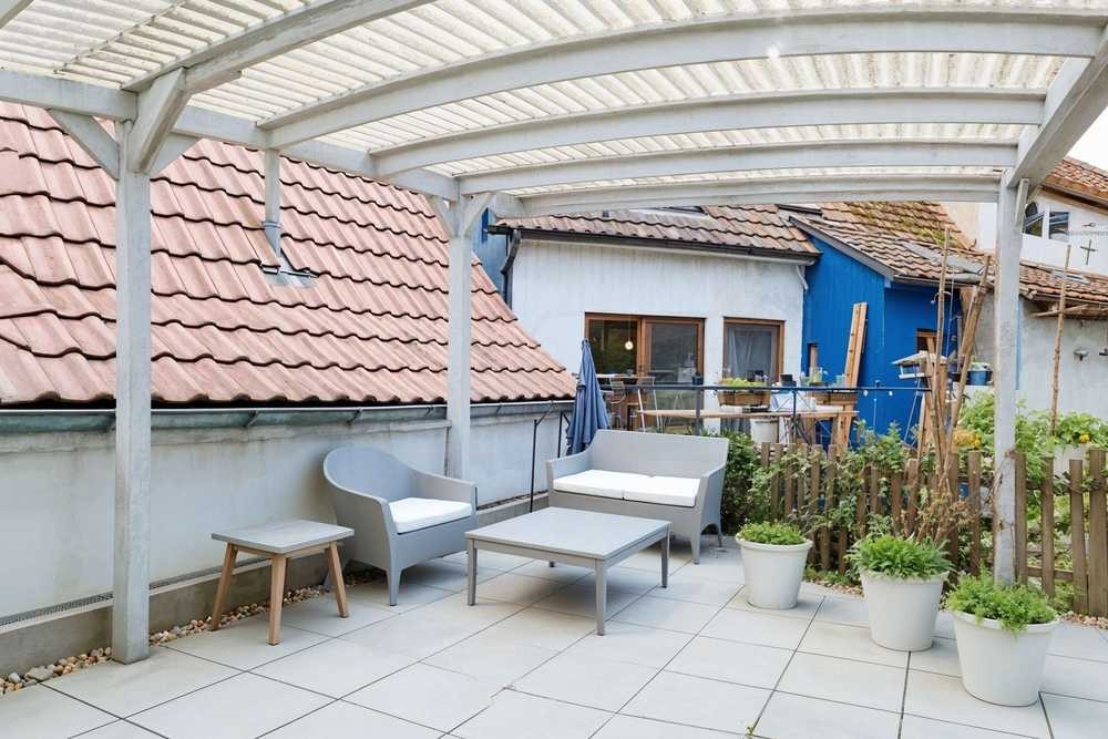 Ein besonderes Highlight ist die überdachte Terrasse – groß genug für eine komplette Sofalandschaft – ein Ort zum Entspannen oder für gesellige Zusammenkünfte im Freien. Direkt angrenzend befindet sich ein praktischer Schuppen bzw. Kellerraum, der zusätzlichen Stauraum bietet.