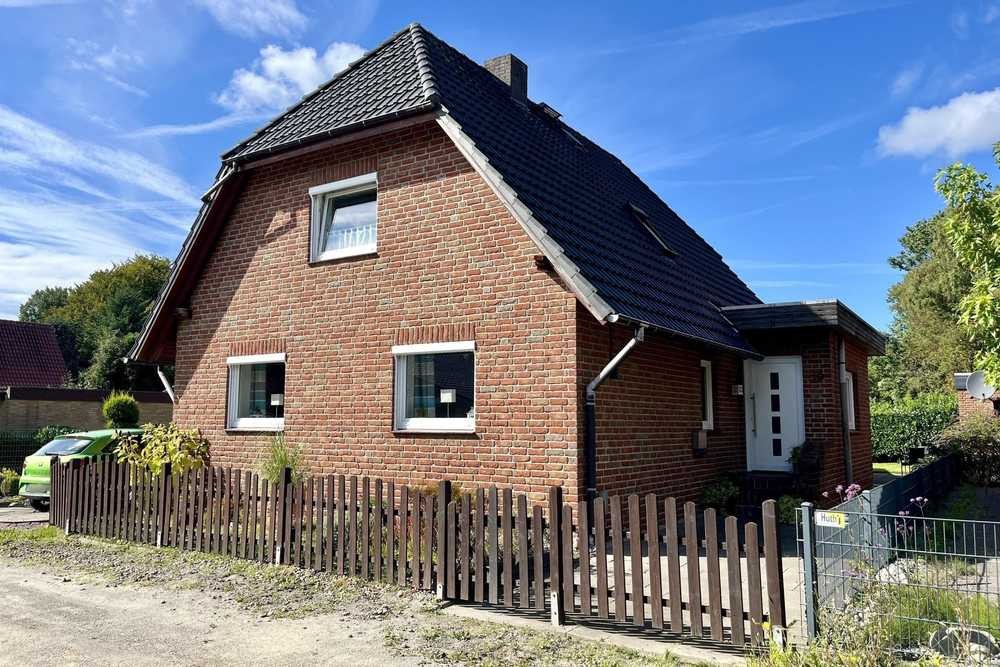Dieses freundliche Einfamilienhaus liegt in einem etablierten Wohnumfeld und wartet auf einen neuen Eigentümer. Das ursprüngliche Baujahr von ca. 1939 sieht man dem Häuschen nicht an, es wirkt durch den vorgesetzten Vollklinker, das Dach und die erneuerten Fenster viel frischer und moderner. Dieses zeigt sich auch im ca. 156 m² großen Wohnraum, welcher sich auf 4 Zimmer, 2 Badezimmer, Küche und Hauswirtschaftraum aufteilt. Ein seltenes Merkmal ist die großzügige Essdiele im Eingangsbereich, welche schnell zum Mittelpunkt des Hauses wird. Hiervon leiten sich alle weiteren Räumlichkeiten ab, auch der Zugang zum Garten. Die restliche Aufteilung ist klassisch, sodass sich im Erdgeschoss noch das Wohnzimmer, Schlafzimmer, Küche, Hauswirtschaftsraum und Wannenbad befinden. Demnach umfasst das Dachgeschoss noch zwei große Zimmer und ein Duschbad. Ein kleiner Keller, der Dachboden und die hoch gebaute Garage bieten abschließend sinnvolle Nutzfläche. Beim Blick auf das ca. 451 m² große Grundstück fällt noch die überdachte Terrasse und der pflegeleichte Gartenteil ins Auge, freuen Sie sich dabei besonders über die Nachmittags- und Abendsonne.