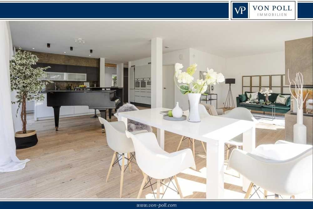 Diese exklusive Villa vereint Luxus, Komfort und Funktionalität auf großzügiger Wohnfläche und ist ideal für große Familien, die viel Platz zum Wohnen suchen. Das Ein-/Zweifamilienhaus befindet sich in einer ruhigen Sackgassenlage und besticht durch seine sonnige Süd-/Westlage, die für eine private und ruhige Atmosphäre sorgt. Der gepflegte Garten mit idyllischem Schwimmteich lädt zu erholsamen Stunden im Freien ein und bietet ein einzigartiges Ambiente. Beim Betreten des Hauses empfängt Sie ein einladender Eingangsbereich mit einer modernen Stahltreppe, die in den offenen, lichtdurchfluteten Wohn- und Essbereich führt. Große Fensterflächen sorgen für eine helle Atmosphäre und geben den Blick auf den Garten und den Schwimmteich frei. Der Wohn-/Essbereich ist zudem mit einer großen, hochwertigen Einbauküche ausgestattet, die keine Wünsche offen lässt. Ein Tresen und hochwertige Geräte von Miele sorgen für höchsten Komfort und Qualität beim Kochen. An kühleren Tagen sorgt der Kaminofen für behagliche Stimmung. Im Erdgeschoss befinden sich außerdem praktische Extras wie eine Garderobe, ein Gäste-WC und ein separates Arbeitszimmer, das sich ideal als Home-Office oder Rückzugsort eignet. Ein Hauswirtschaftsraum sorgt für Ordnung und Stauraum. Für Ihre Fahrzeuge stehen eine Garage, ein Carport vor der Garage sowie drei Stellplätze in der Einfahrt zur Verfügung. Auch vor dem Haus auf der Straße ist genügend Platz so dass ausreichend Parkmöglichkeiten für Familie und Gäste vorhanden sind. Dieses Einfamilienhaus besticht nicht nur durch seine großzügige Wohnfläche und die durchdachte Architektur, sondern auch durch seine moderne Ausstattung. Es ist der perfekte Ort für eine große Familie, die das Leben in einem exklusiven und komfortablen Zuhause genießen möchte.