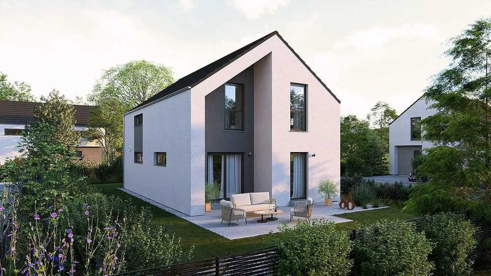 Auf zwei Ebenen vereint dieses Haus durchdachte Planung mit markantem Design. Die Fassade spielt mit Symmetrien und verleiht dem Baukörper eine besondere Präsenz, während der überdachte Eingang einen geschützten, einladenden Empfang schafft. Im Erdgeschoss öffnet sich die Diele zu einer klar gegliederten Raumfolge: Hauswirtschaftsraum und Gäste-WC sind dezent platziert, ein separates Büro bietet Rückzug für konzentriertes Arbeiten. Herzstück ist der offene Wohn-, Ess und Kochbereich, in dem großzügige Flächen und fließende Übergänge das Miteinander zum Erlebnis machen. Im Dachgeschoss sorgt die clevere Grundrissgestaltung für große Räume und einen bewusst klein gehaltenen Flur. Zwei helle Kinderzimmer, ein Elternschlafzimmer und ein komfortables Bad mit Wanne und Dusche schaffen Platz für alle Lebensphasen. Mit 149 m² bietet dieses Haus Raumqualität, die inspiriert - funktional, großzügig und im Detail präzise gestaltet.