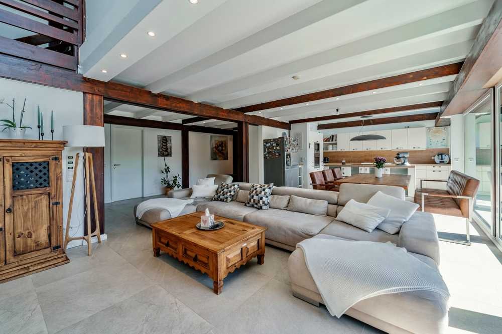Die großformatigen Fliesen verleihen dem Raum einen modernen Touch und sorgen in Verbindung mit der Fußbodenheizung für eine angenehme Wärme. Der großzügige Wohnbereich mit etwa 55 m² lädt förmlich zu geselligen Familienabenden ein.