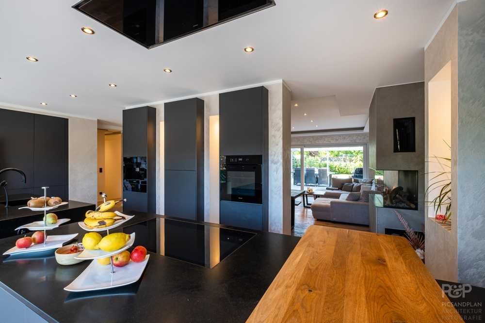 Der Wohnbereich mit halboffener Küche geht vom Flur ab. Einbauspots, abgehangene Decken mit integrierter Beleuchtung, Kamin, Zugang zum Garten u. v. m. erfüllen Ihren Wunsch an exklusives Wohnen.