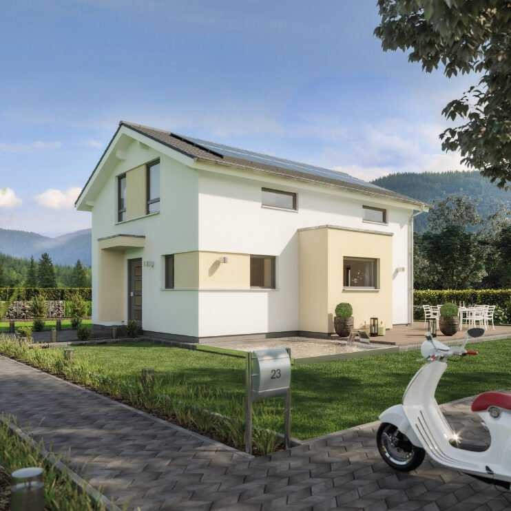 Das Haus ist auf einem realen Baugrundstück geplant oder auf einem Grundstück in einer Planungsphase. Die Bilder zeigen ggf. Extras, die im Rahmen des Bebauungsplans noch geprüft werden müssen.