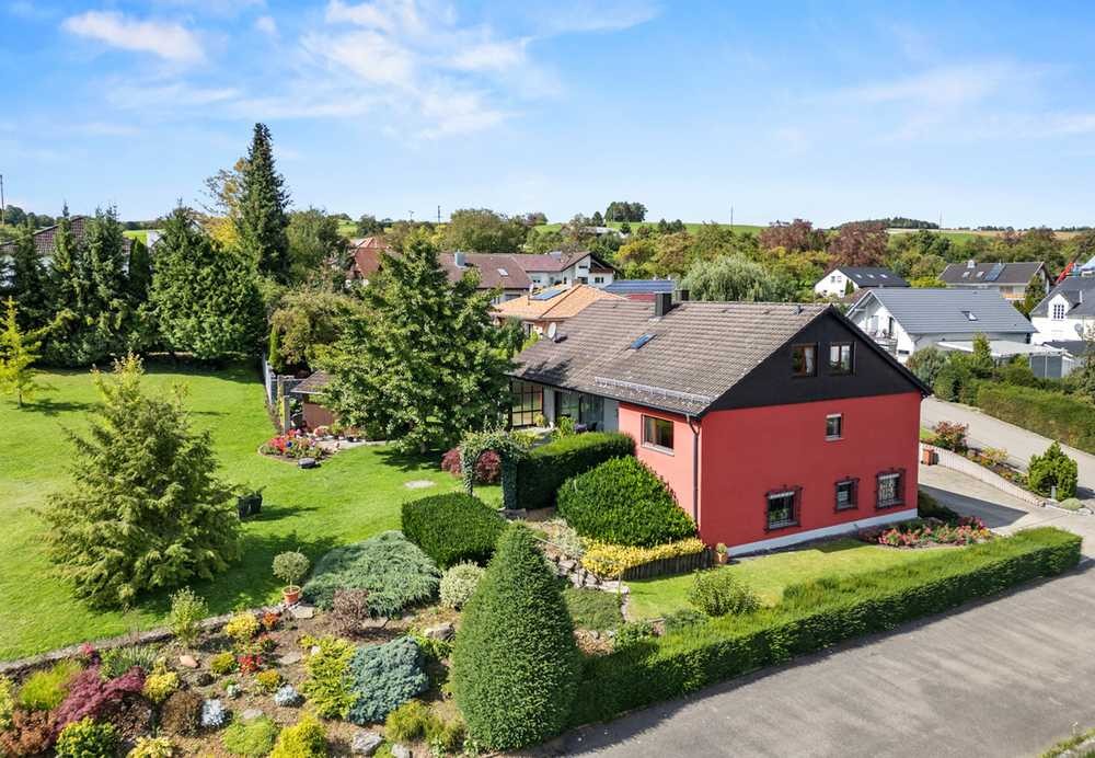 Dieses äusserst gepflegte Einfamilienhaus aus dem Jahre 1978 mit Appartement im Dach und zusätzlichem Büro im Untergeschoss bietet Ihnen ein grosszügiges und vielseitiges Wohn - und Arbeitsumfeld in ruhiger und naturnaher Lage. Auf dem liebevoll angelegtem Grundstück mit wunderschönem Garten sowie einem separatem Baugrundstück ( + 182.000.- € ) präsentiert sich die Immobilie in einem hervorragenden Zustand – ideal für Familien, Freiberufler oder Mehrgenerationenwohnen. Das Haus überzeugt durch seine durchdachte Raumaufteilung, hochwertige Materialien und die helle freundliche Atmosphäre. Im Erdgeschoss befindet sich der grosszügige Wohn-Essbereich mit Zugang zur sonnigen Terrasse und dem Garten. Ein Gäste-WC, Bad mit Dusche, Wanne und Toilette , Schlafzimmer mit Zugang zur Terrasse und zwei Kinderzimmer runden das Angebot im EG ab. Im Dachgeschoss befindet sich ein ausgebautes Appartement mit eigenem Bad. Der westliche Teil des DG ist teilausgebaut und es besteht die Möglichkeit diesen als Wohnraum mit einer Loggia auszubauen. Im Untergeschoss ( Eingangsbereich ) steht ein Büro mit zwei Räumen und Toilette zum Arbeiten im Homeoffice oder Nutzung als Praxis oder Wohnraum zur Verfügung. Weitere Keller und ein grosser Hobby/Kellerraum sorgen für ausreichend Stauraum. Eine Doppelgarage und Raum für Gartengeräte befindet sich in der Einfahrt. Ein Highlight ist der liebevoll angelegte Garten, mit Wasserspiel und Gartenhaus sowie das separate, genehmigte Baugrundstück – welches bereits parzelliert ist und Nutzungsmöglichkeiten zur Kapitalanlage, Erweiterung, Verkauf oder Bebauung bietet. Der Verkauf erfolgt nur im Ganzen – Haus und Baugrundstück = Gesamtpreis 741.000.- Euro. Gerne mehr im persönlichen Gespräch und vor Ort.
